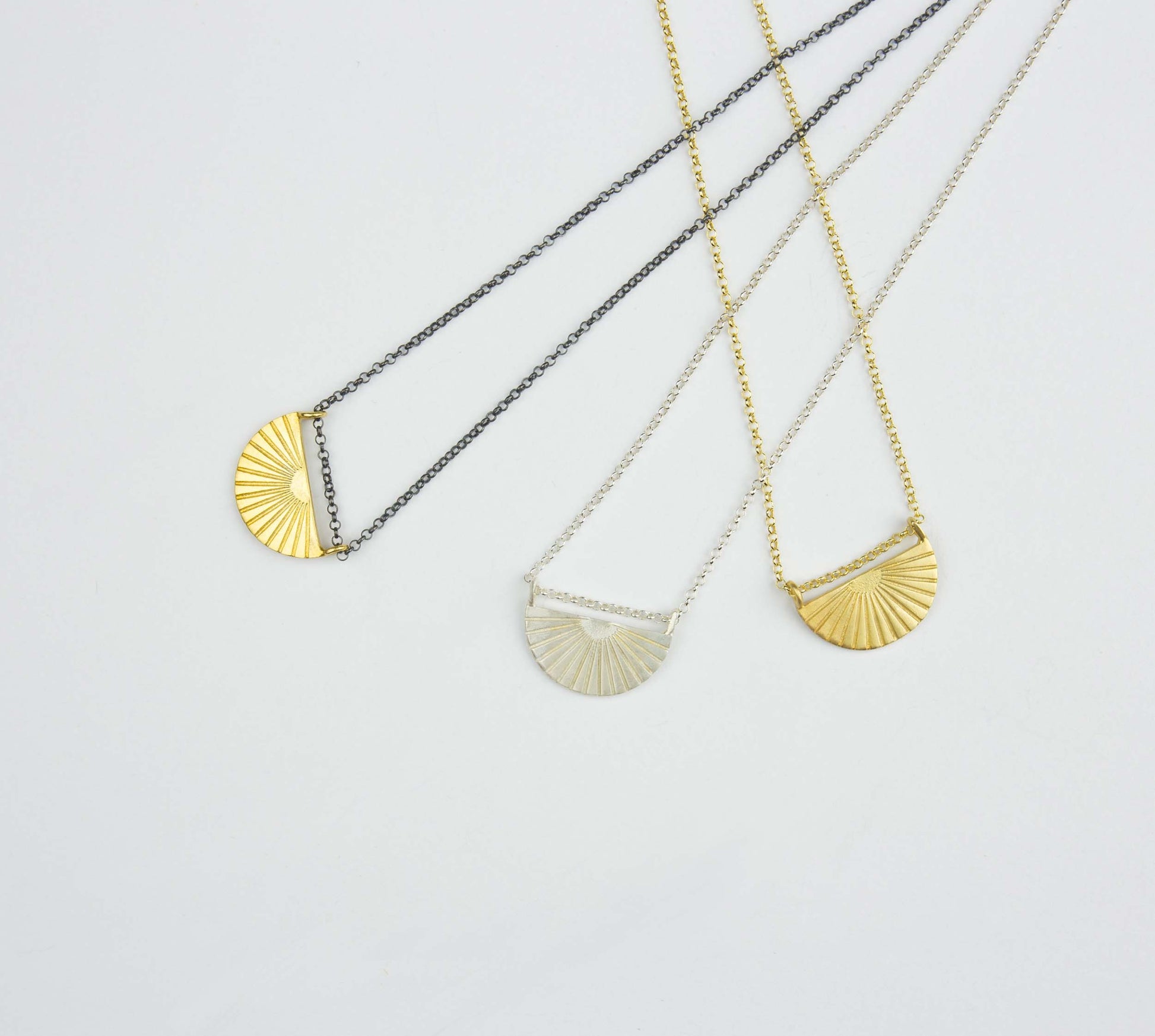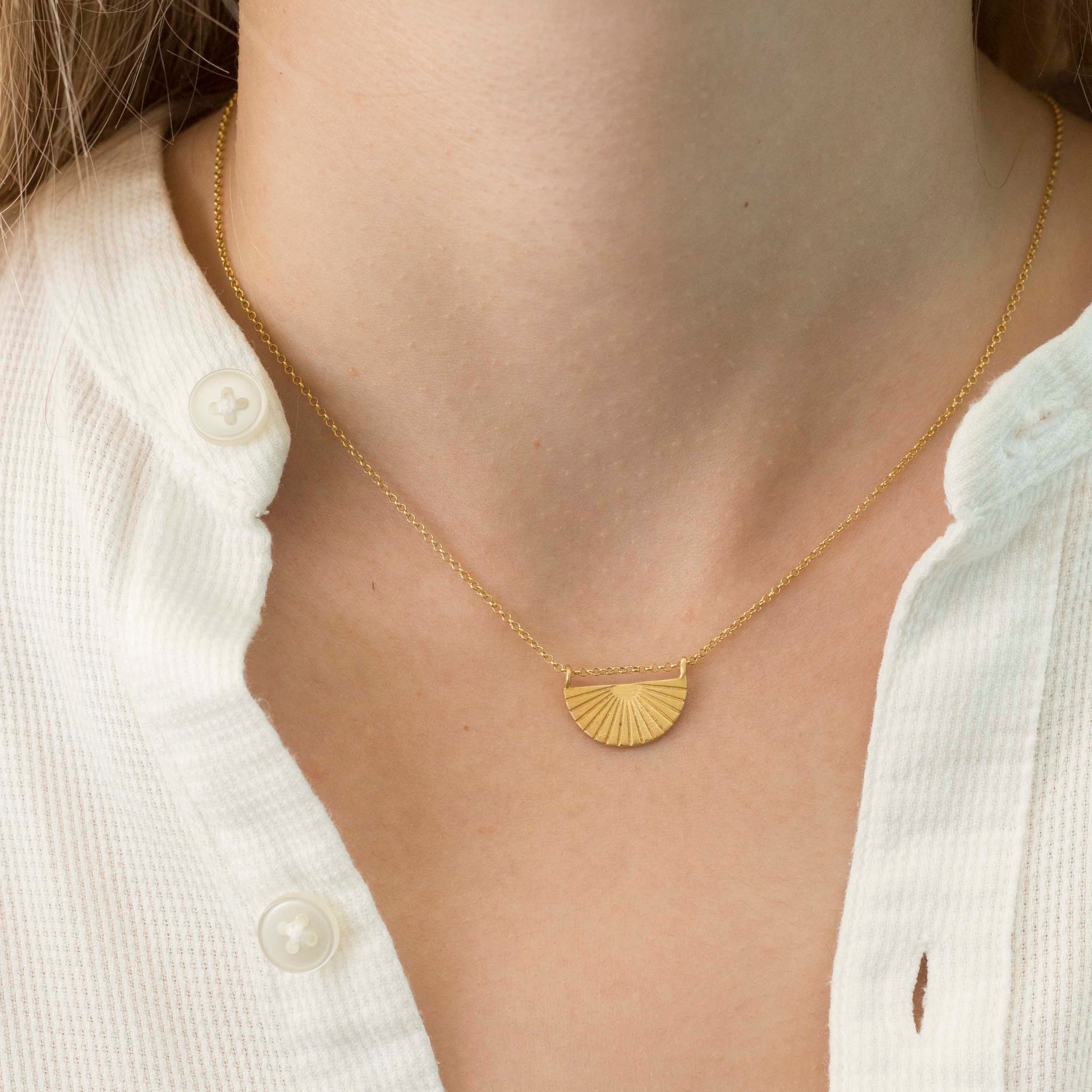 A bold semi-circle engraved circle is the ideal necklace for any occasion and outfit. It is perfect for layering necklaces.