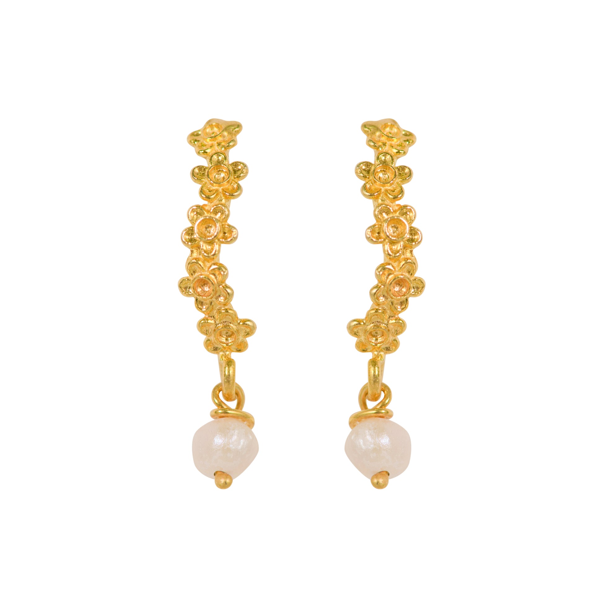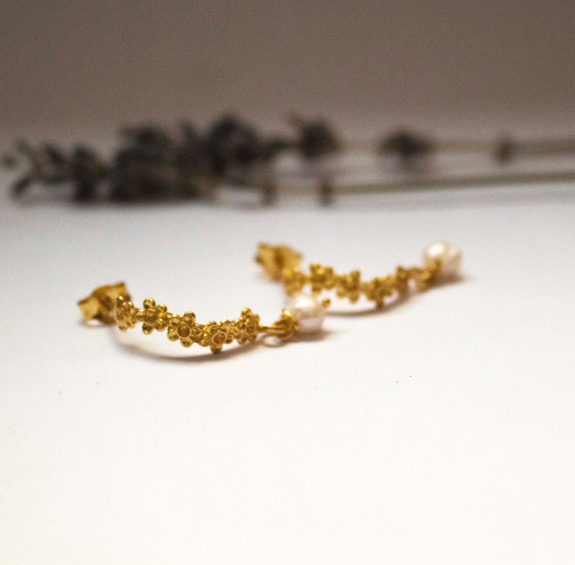 A line with joined daisies and a small pearl hanging in the bottom are a pair of earrings that bring the romantic tone in your style.