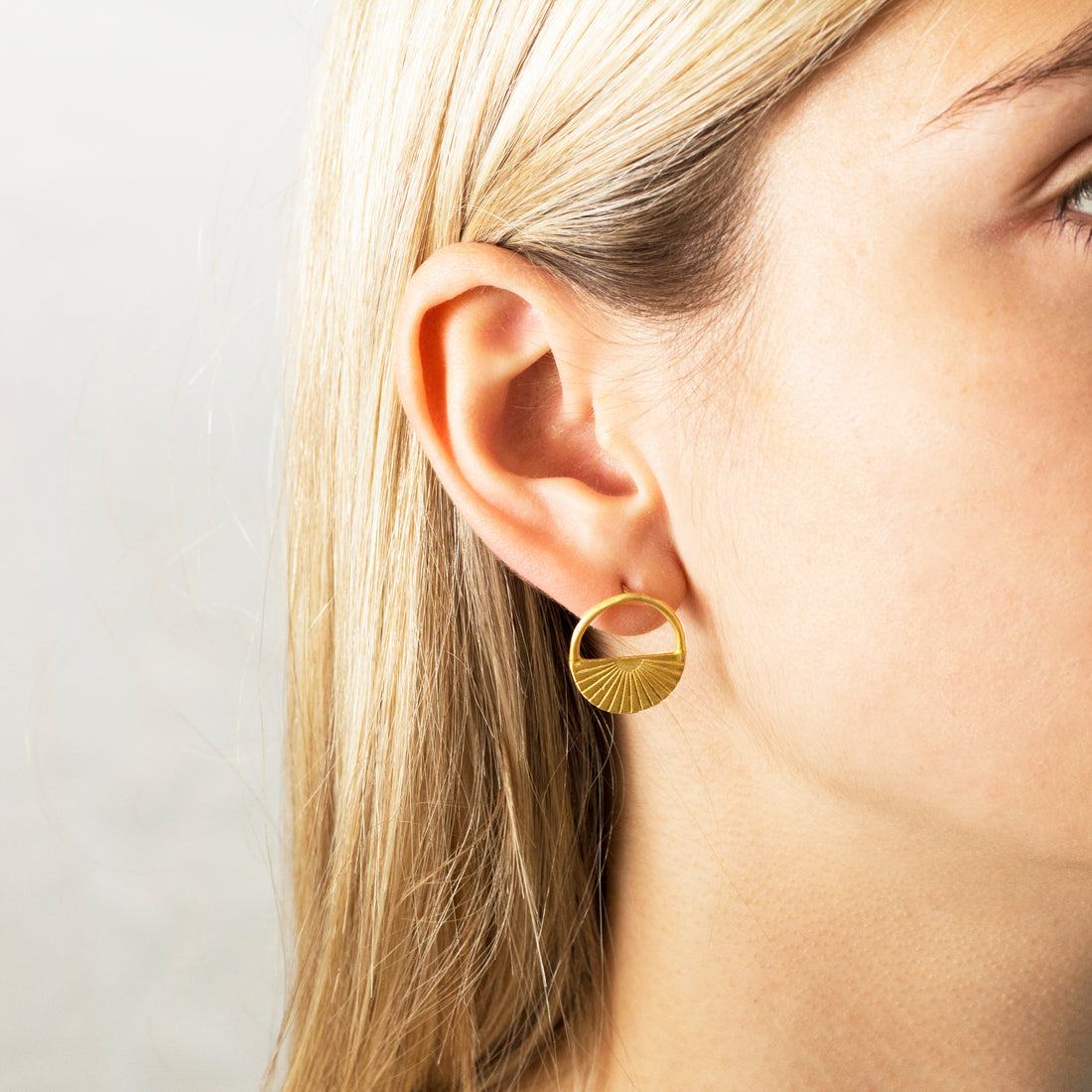 A pair of stud earrings in the shape of a circle. On the upper part...