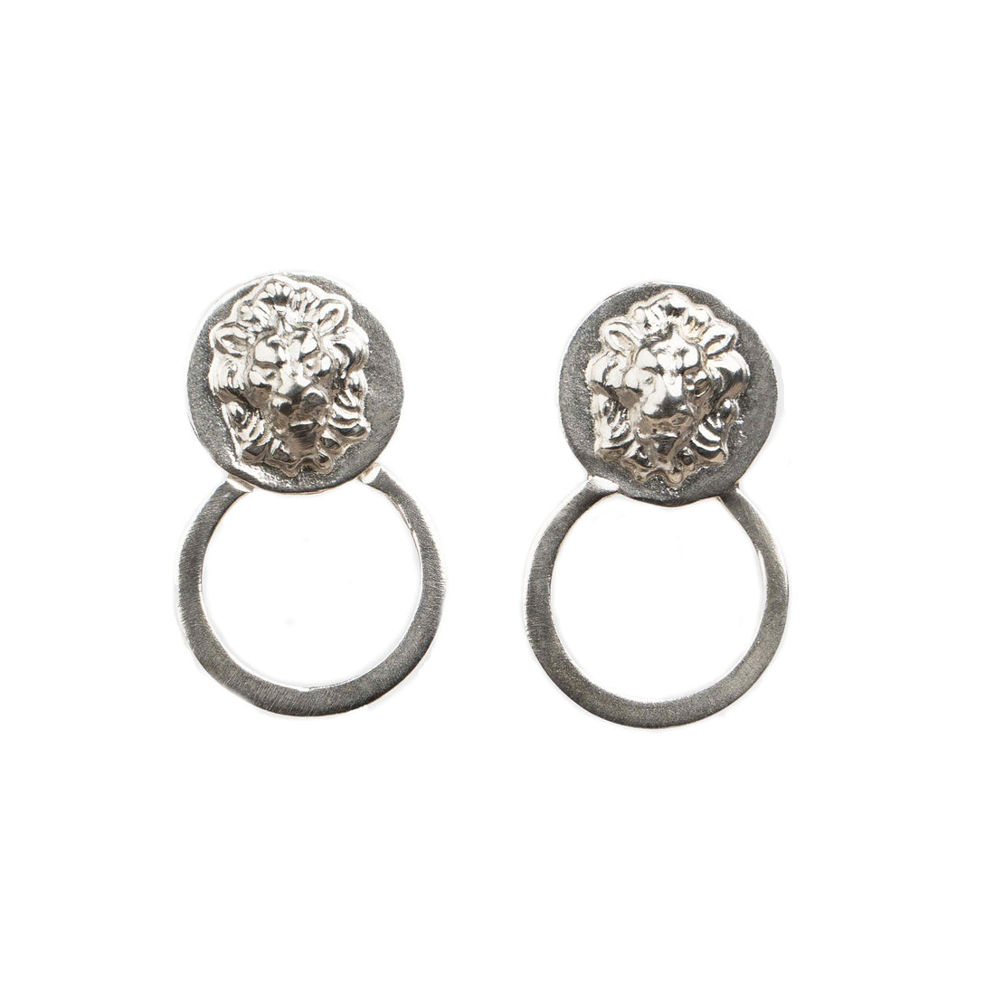 Two circular forms of different diameter are joined with a figure of a lion on...