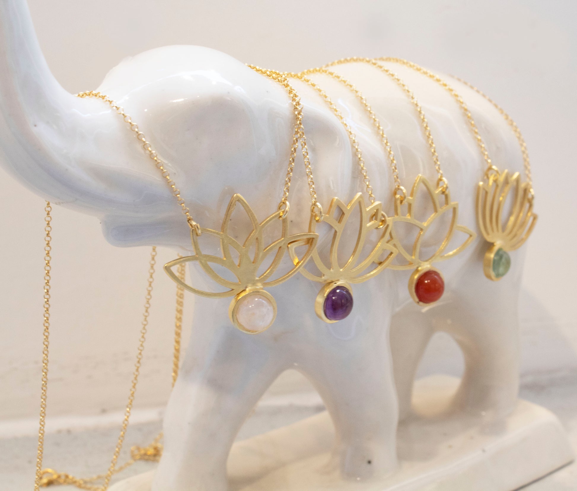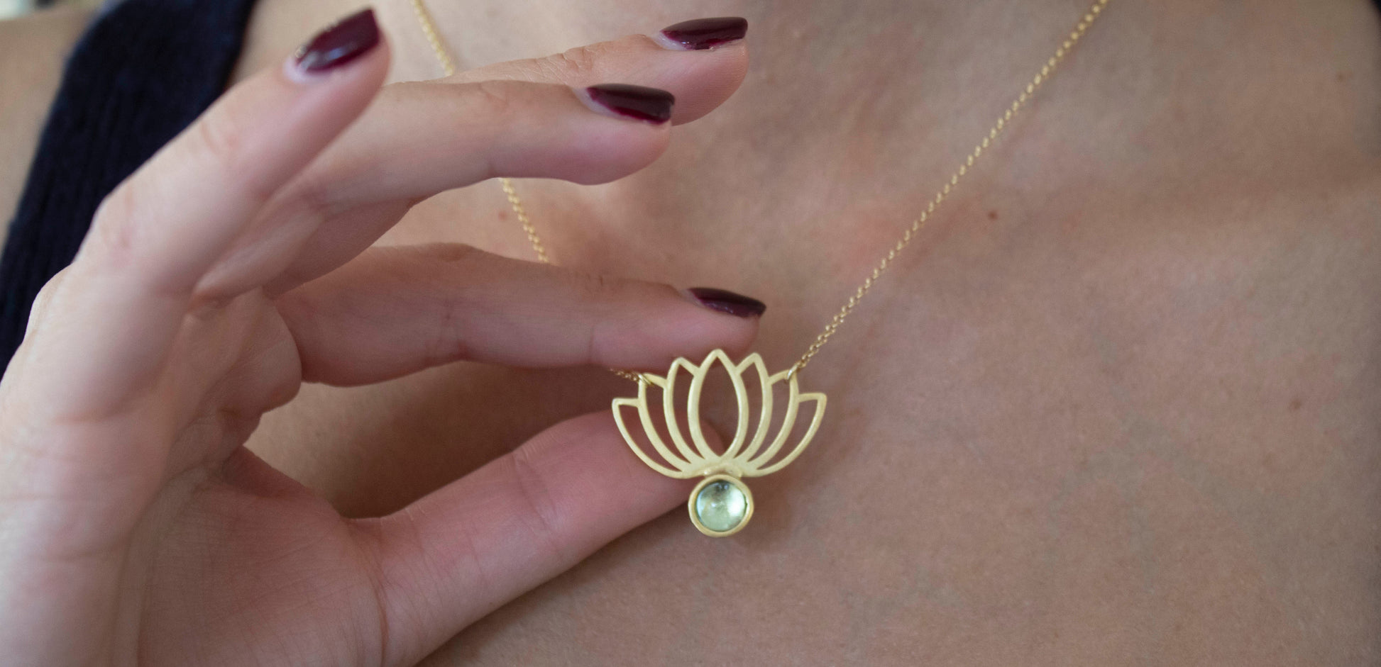 An exquisite, medium sized gold-plated silver necklace with silver chain and a basic motif of lotus flower with a topaz cabochon stone on the bottom. A very unique necklace that stands out itself.