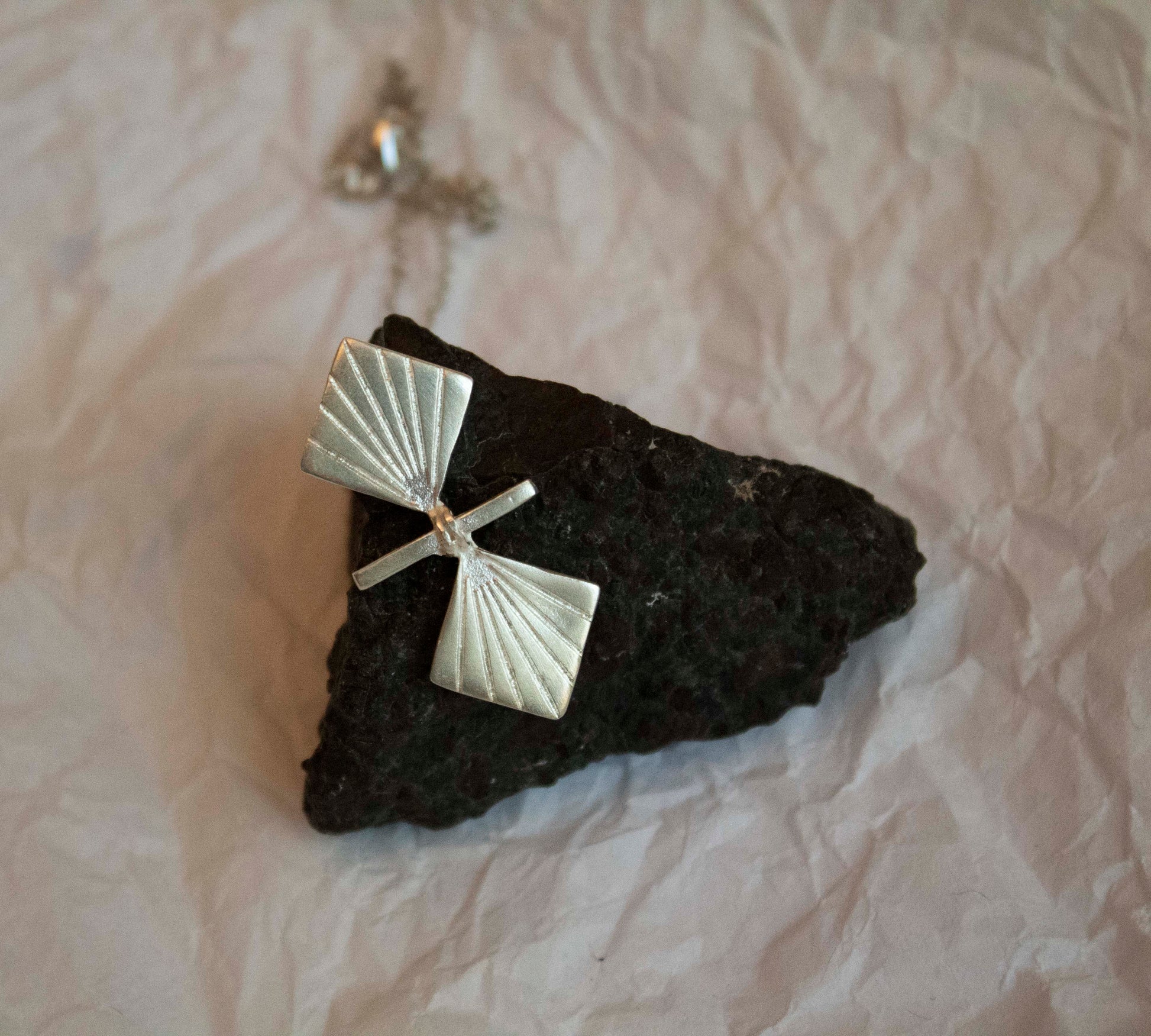Two geometric forms of rectangles are joined diagonal with a small wire in the middle and they create a unique necklace. It is a sui generis piece of jewelry for women with a more demanding aesthtics.