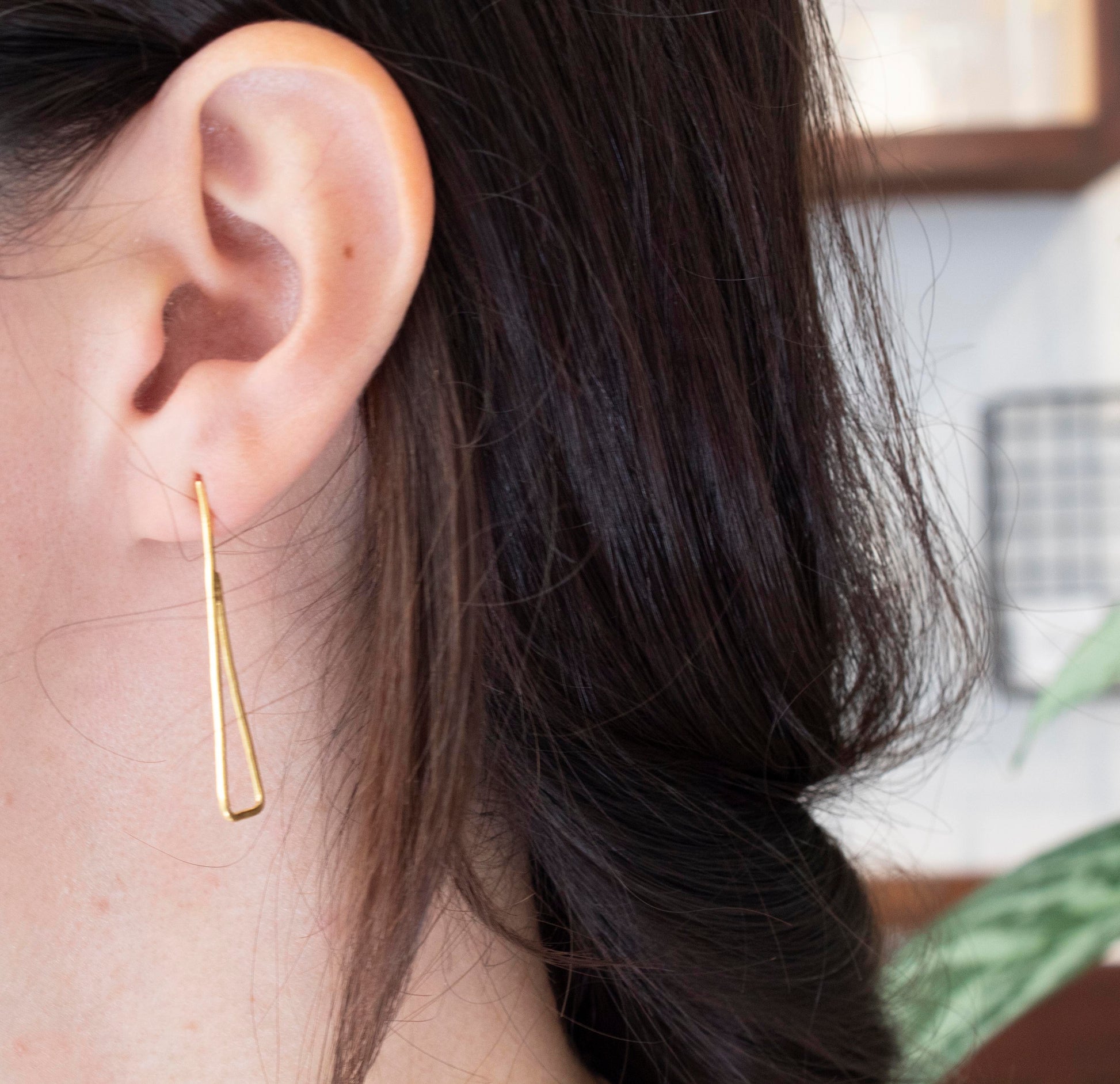 A pair of earrings that are inspired by Bauhaus movement in minimal design. These earrings in the front are like a simple line , but profiled is an empty framed vertically right triangle attached to a line.