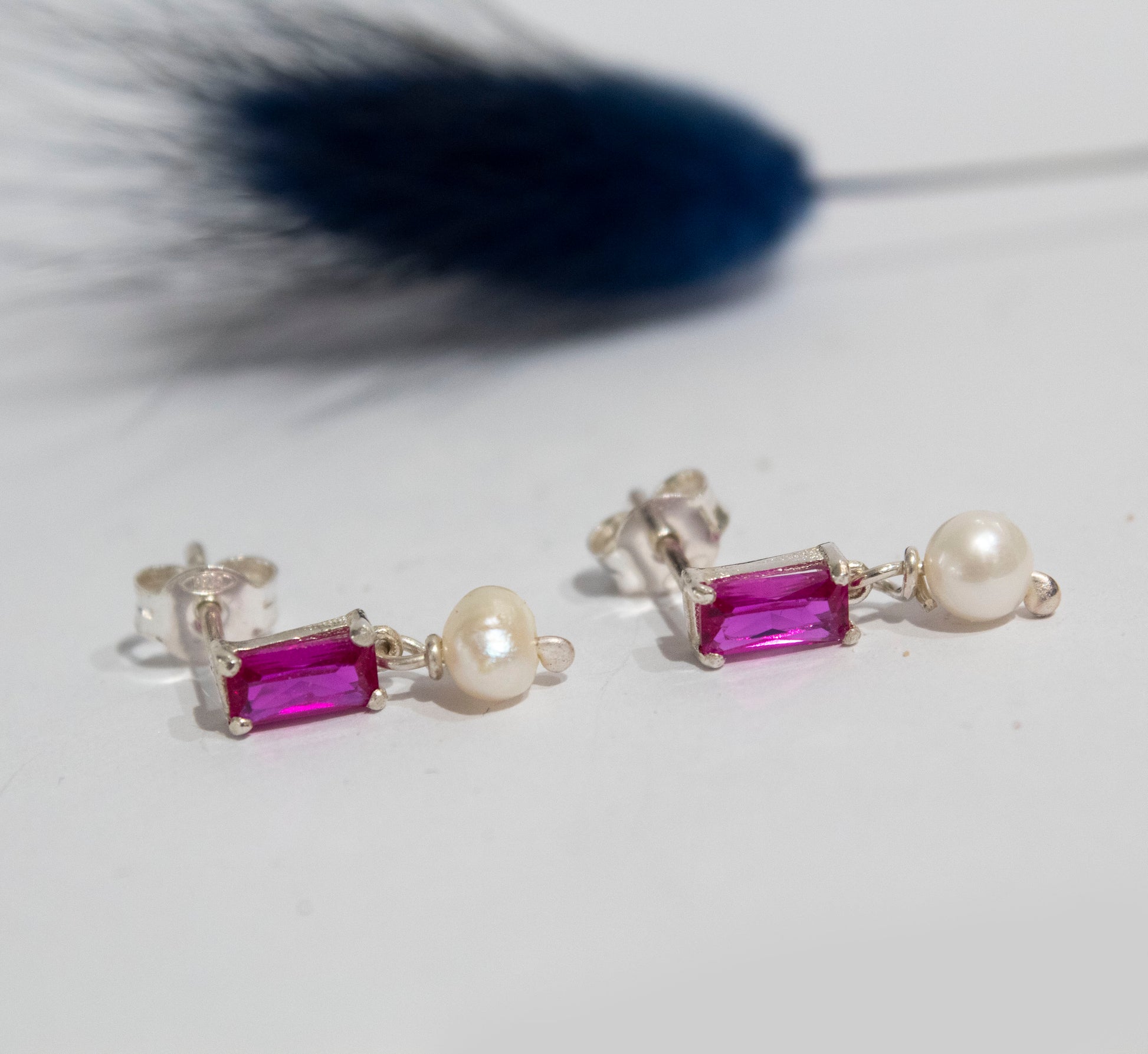 Simplicity Baguette Fucsia Zircon Pearl Stud Earrings
